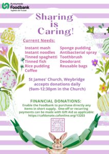 Runnymede Foodbank meet every week on a Thursday from 12.30 – 2:30pm in St James’ Church. Refreshments available.