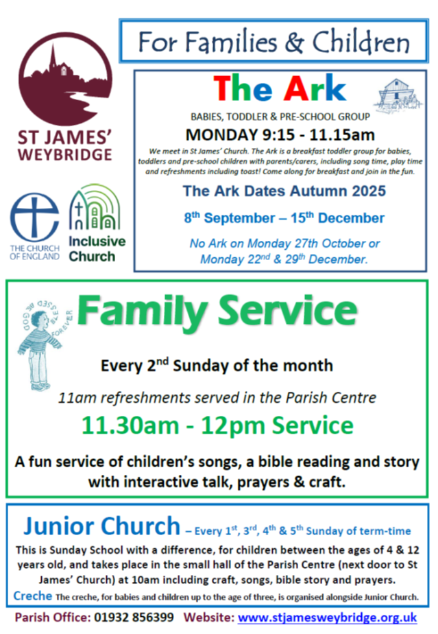 FAMILY SERVICE 11:30am 2nd Sunday monthly for 30 minutes – worship for families with children (aged up to 14 years) with fun songs, bible story, craft, talk, drama and stickers! Just turn up. Contact: stjamesweybridge@btinternet.com