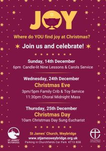 Weybridge Christmas Festival – Sunday 30th November from 11.30am – 6pm, with Christingle at 4pm (special Guest, the Bishop of Guildford).