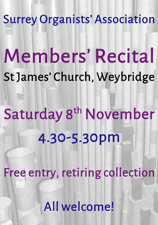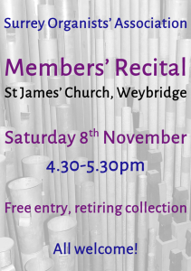 Surrey Organists’ Association – Members’ Recital – Saturday 8th November 4.30-5.30pm. Free entry, retiring collection.