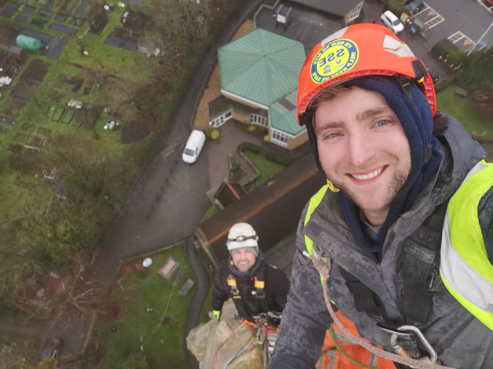 The Photos show Carlo and Sam at 145feet high, looking back down towards the Parish Centre, a view of Sam looking out towards the Quadrant and Men’s Shed, and a roof level view looking up at the work being undertaken.